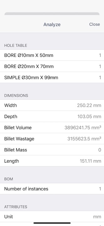 - View Attributes, Holes Information, Instances, and Billet Volumes in the Analyze dialog.