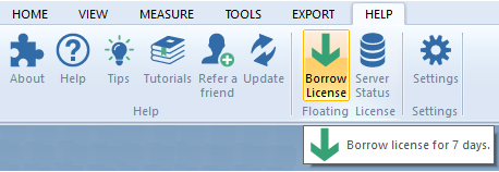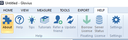 Launch Glovius & click on the “Help” tab > “Borrow License” icon. You can borrow a Glovius floating license for 7 days. After 7 days the license is automatically returned. You can also return the license anytime using the “Return”button