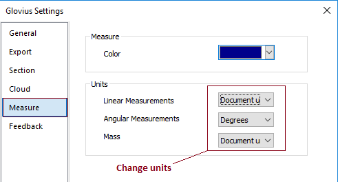 2. In the Settings dialog, in “Measure” tab, and change the Measurement Units for Linear Measurements, Angular Measurements and Mass.