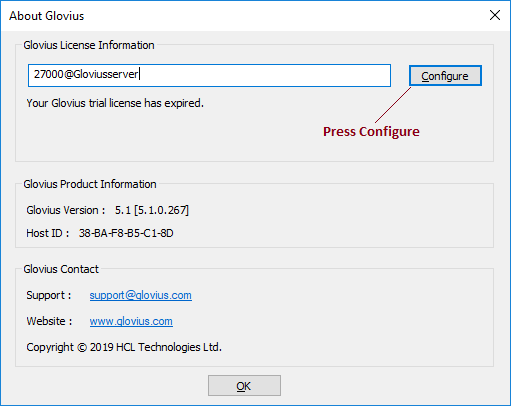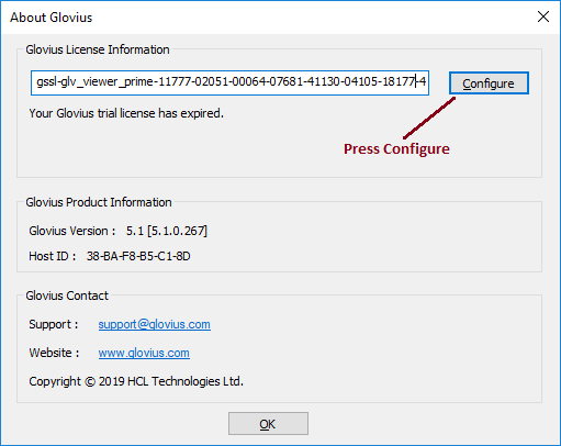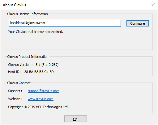 Here are the steps to configure your nodelocked license – 1. Launch Glovius & click on the “Help” tab > “About” icon 2. In the About dialog, paste the license key and press “Configure”