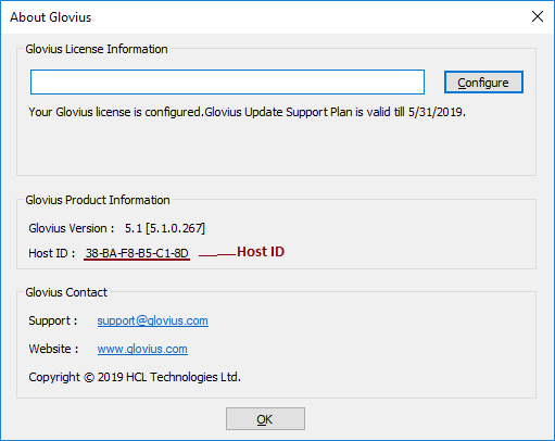 You can also get this information inside Glovius. Start Glovius & click on the “Help” tab > “About” icon. Share the Host ID.