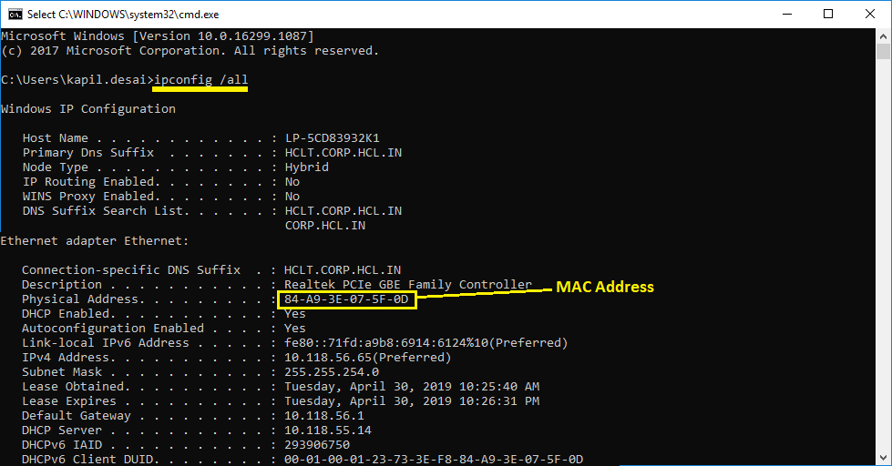 • MAC address is the “Physical Address” under Ethernet adapter Local Area Connection. It is a 12 digit alphanumeric code and looks like 00-11-22-33-CC-DD.